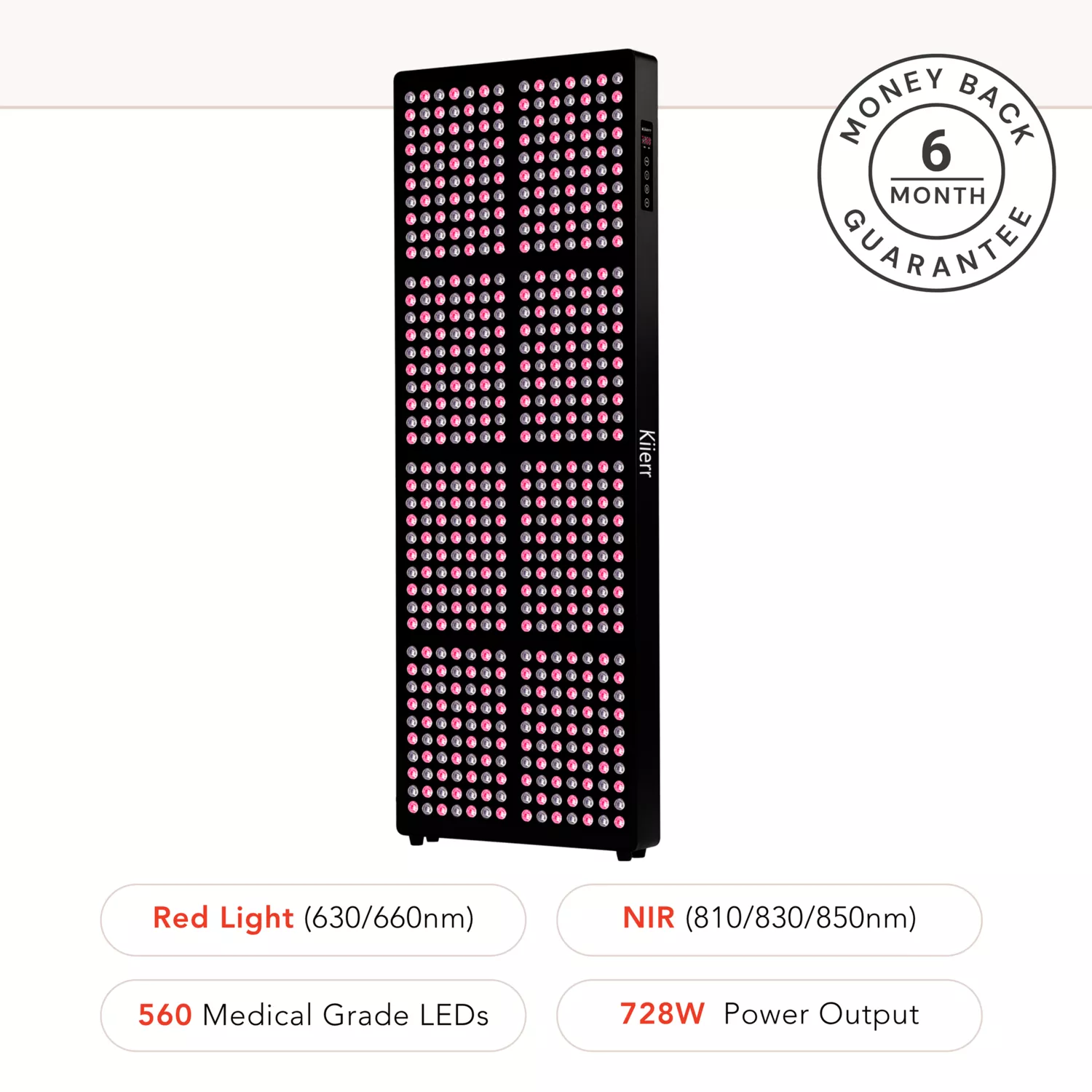 45.5 x 16.3 x 2.8 inches, 560 LEDs, 728W power output, wavelengths include red light: 630nm (56 LEDs), 660nm (224 LEDs), and near-infrared: 810nm (32 LEDs), 830nm (24 LEDs), 850nm (224 LEDs); 5 to 30 minute timer; 3 working modes (dual, red, NIR).
