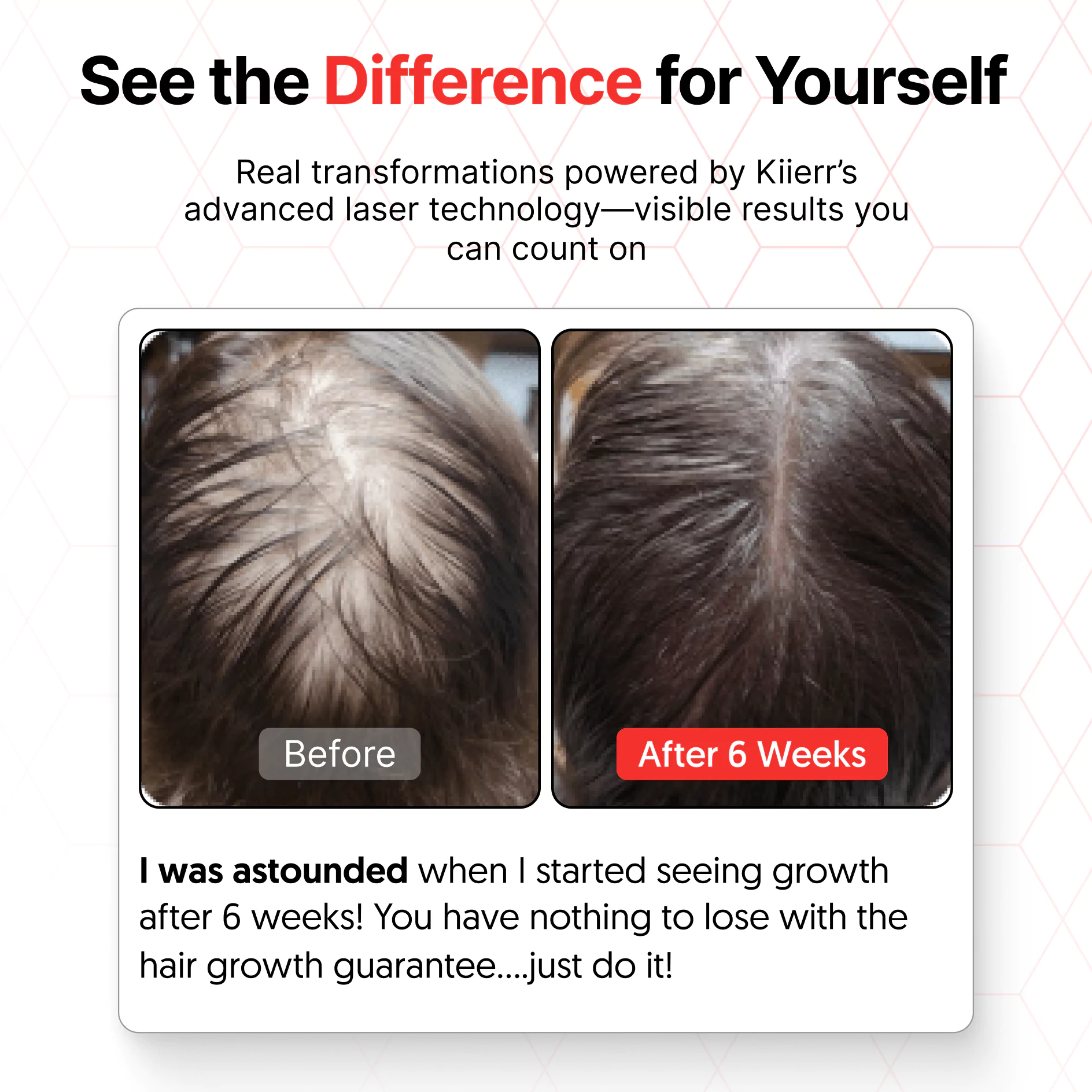 The earlier you start treating hair loss, the better your results. Laser therapy works best on active follicles, so waiting can mean fewer hairs to save. With Kiierr’s risk free guarantee and flexible payment plans, there’s nothing holding you back.