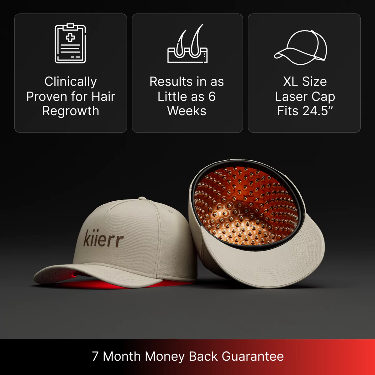 Kiierr offers a 7 month growth guarantee. If you don’t see results and you’ve used the cap as directed, you can request a refund. See full details here. We stand behind the science and thousands of successful customer outcomes, but we also believe in risk free support for your hair journey.