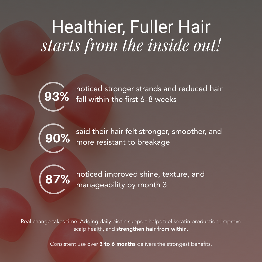 Most people begin noticing healthier looking hair within a few weeks, with fuller looking growth appearing over the next couple of months. Biotin supports the natural growth cycle, so consistency is the key to visible results.