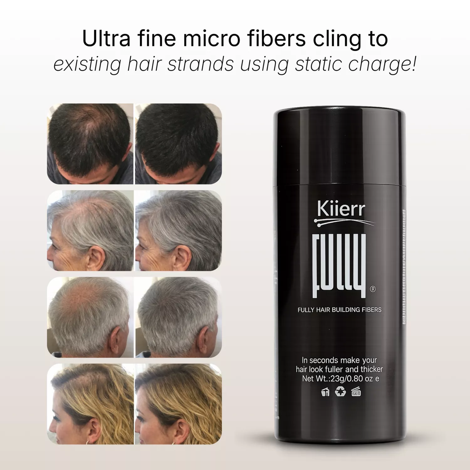 Kiierr Hair Building Fibers are cosmetic micro fibers designed to attach to your existing hair strands and instantly create the appearance of thicker, fuller hair. They are not a spray dye or powder. Each fiber mimics the look and movement of real hair, allowing sparse areas to look naturally filled in rather than covered up