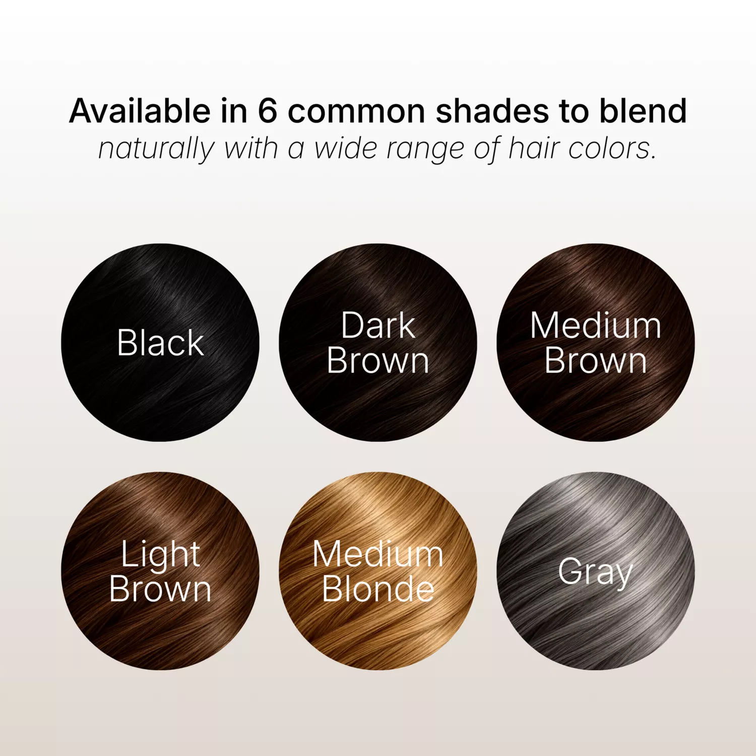 Kiierr Hair Building Fibers are available in 6 shades: black, dark brown, medium brown, light brown, medium blonde, and gray. For the most natural result, choose the shade closest to your root color rather than the ends of your hair. If you are between shades or have multi tonal hair, blending 2 colors can create an even more seamless match.