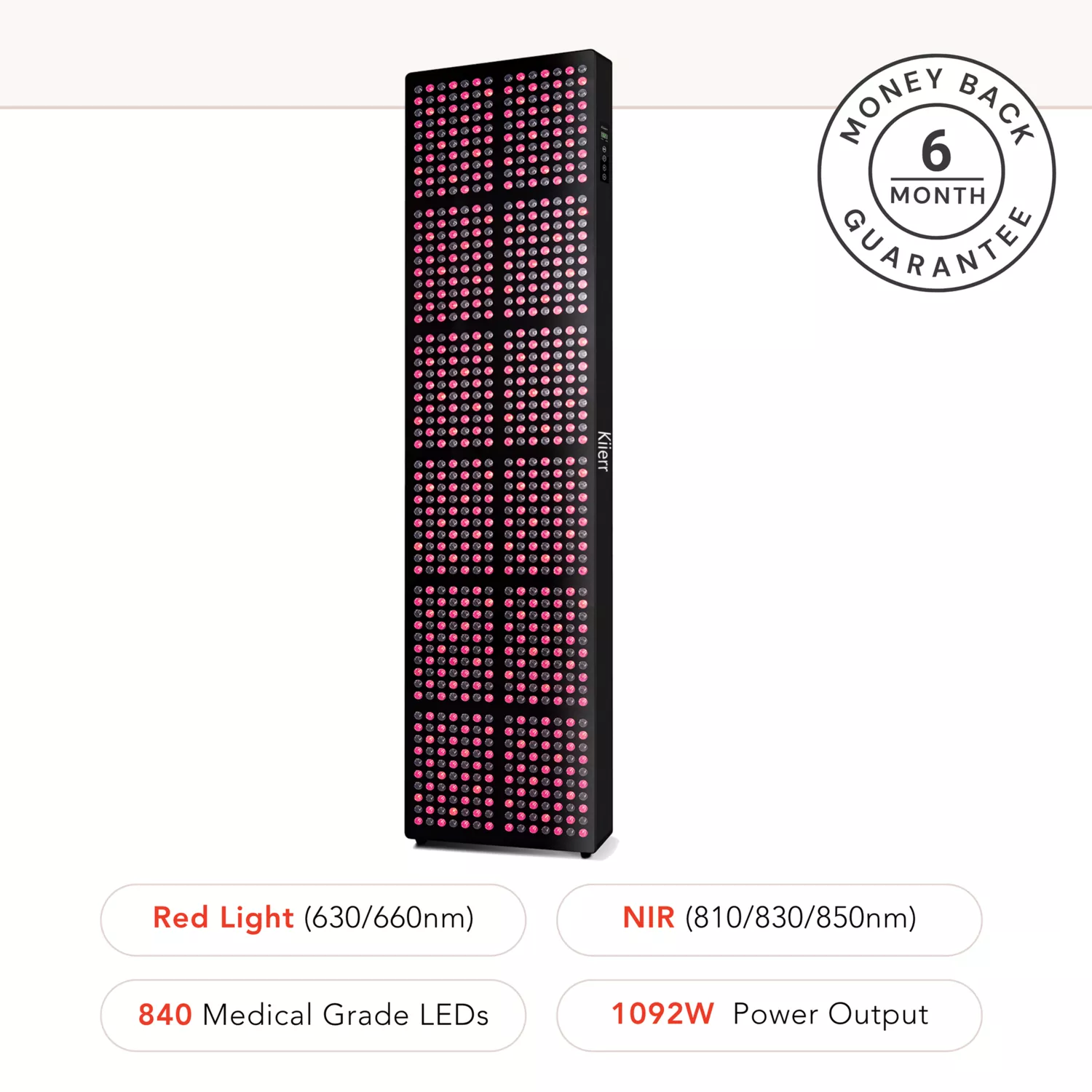 67.4 x 16.3 x 2.8 inches, 840 LEDs, 1092W power output, wavelengths include red light: 630nm (84 LEDs), 660nm (336 LEDs), and near-infrared: 810nm (48 LEDs), 830nm (36 LEDs), 850nm (336 LEDs); 5 to 30 minute timer; 3 working modes (dual, red, NIR).